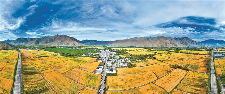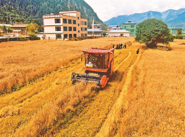 在拉萨市墨竹工卡县唐加乡莫冲村,田间地头繁忙景象扑面而来。几台大型收割机轰鸣着在金色的农田里来回穿梭,收割、脱粒一气呵成,村民们跟在机器后方,有条不紊地进行后续整理工作,呈现出一派热火朝天的丰收场景。村民贡嘎顿玉向记者介绍,“我家共有37亩农田,10亩种小油菜,27亩种青稞。以前全家4口上阵得忙上一个多月,现在有了机械化作业,短短几天就能完成所有秋收工作,既省时又省力。”