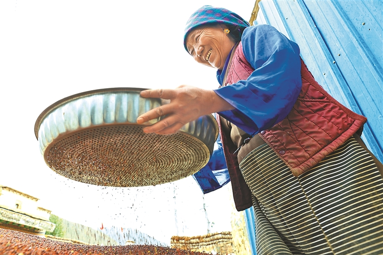 拉萨市墨竹工卡县唐加乡莫冲村村民正在筛菜籽。记者 旦增兰泽 通讯员 洛克 摄