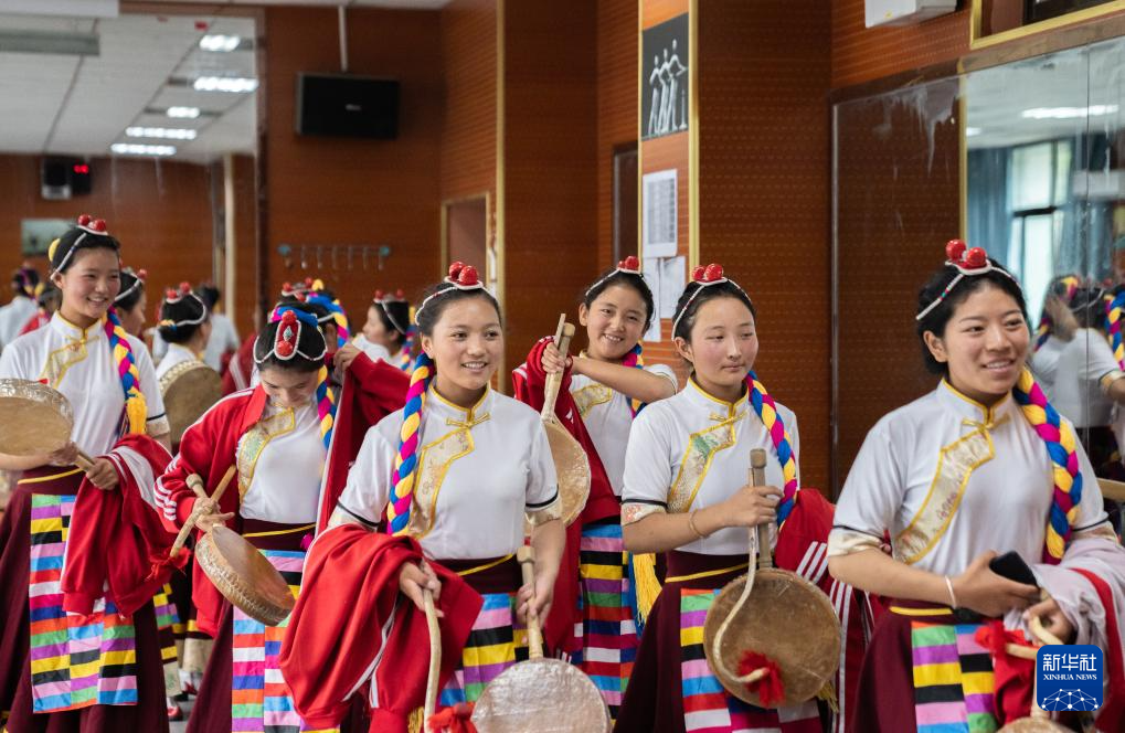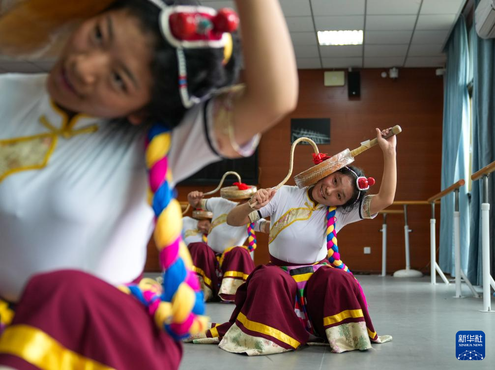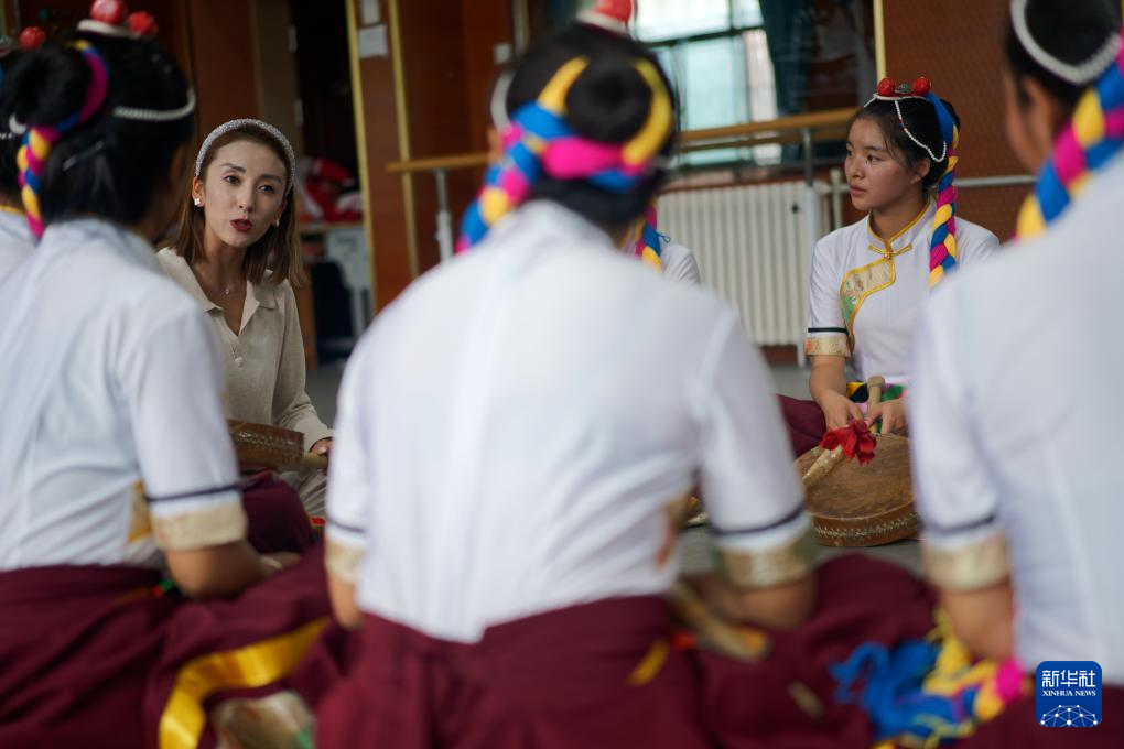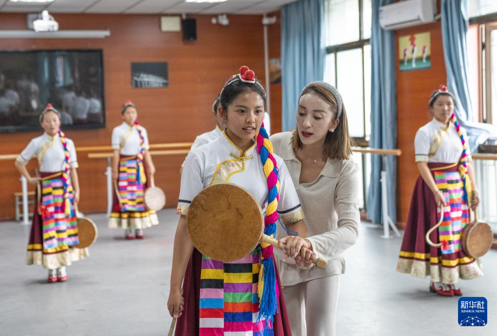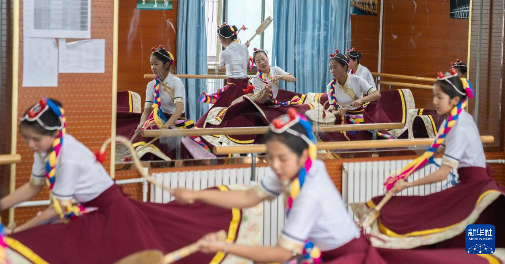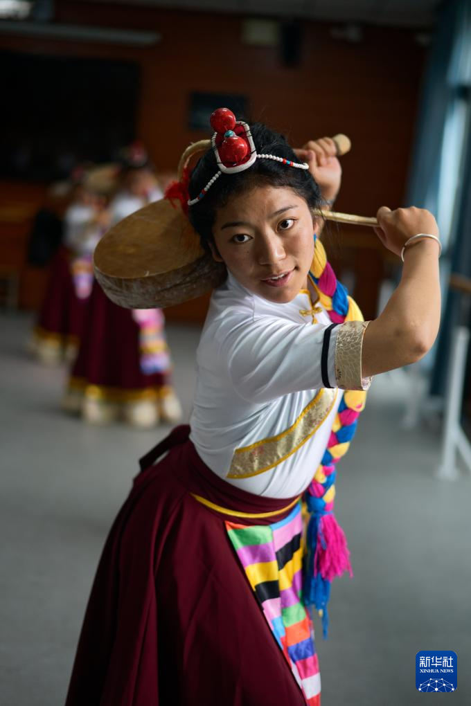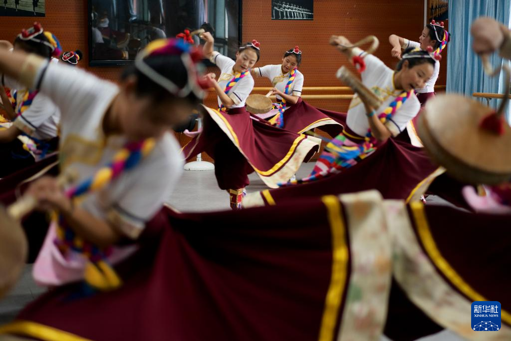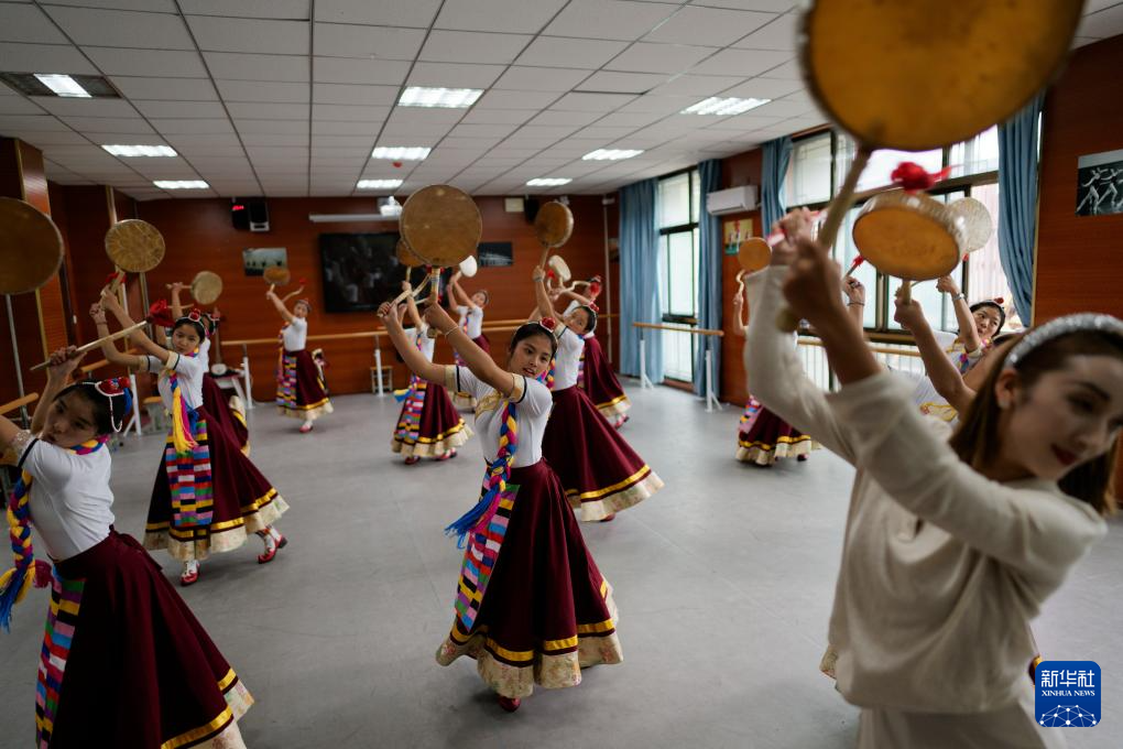 9月9日,在拉萨市第二中等职业技术学校,孩子们在练习热巴舞。新华社记者 张笑宇 摄