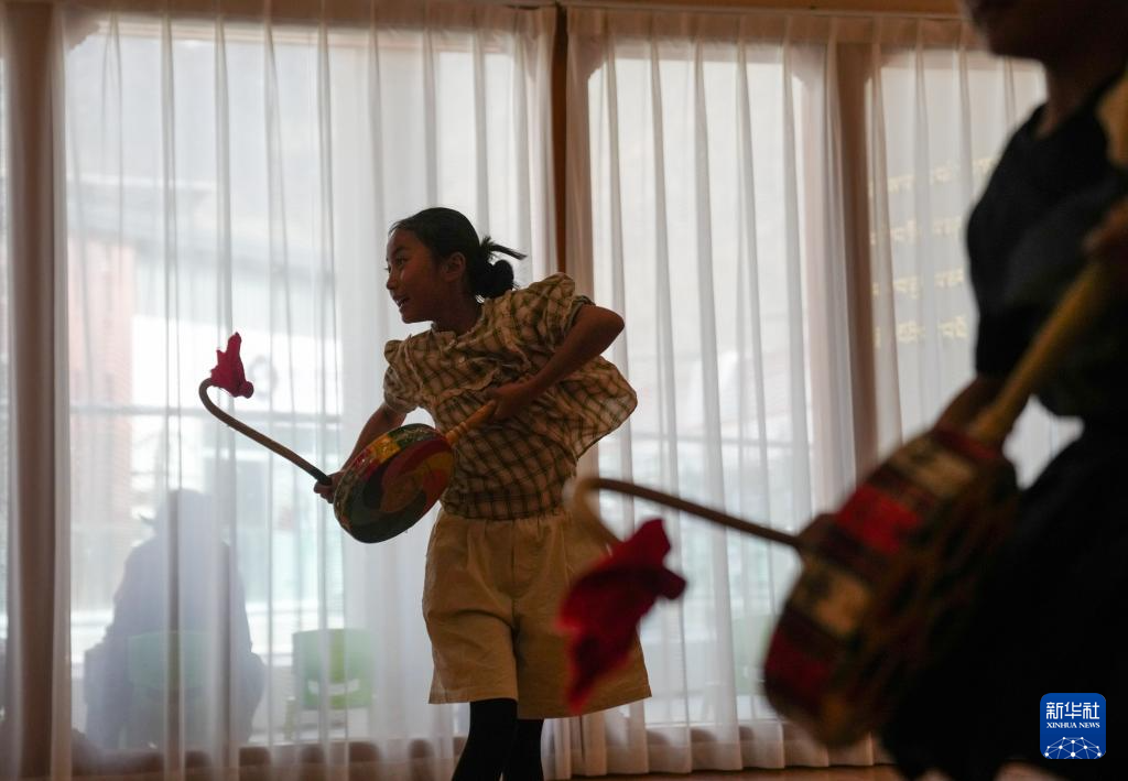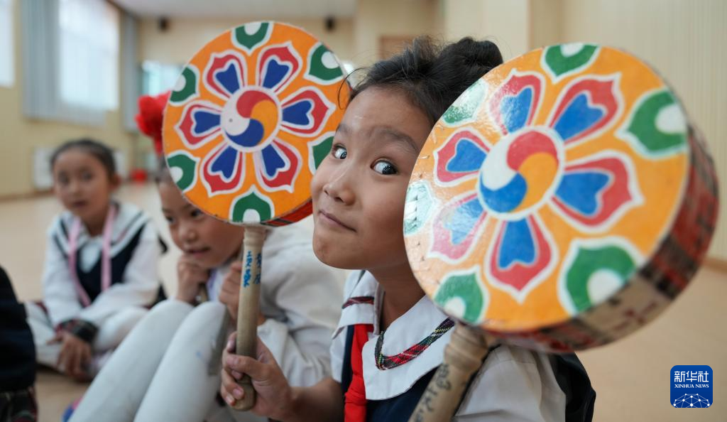 9月11日,在拉萨市实验小学,孩子在练习热巴舞间隙捧起绘有彩纹的热巴鼓。新华社记者 晋美多吉 摄