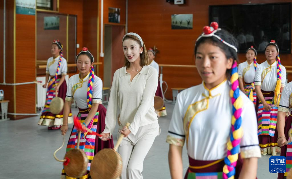 9月9日,在拉萨市第二中等职业技术学校,尼玛卓玛老师(左三)在指导孩子们舞蹈动作。新华社记者 晋美多吉 摄